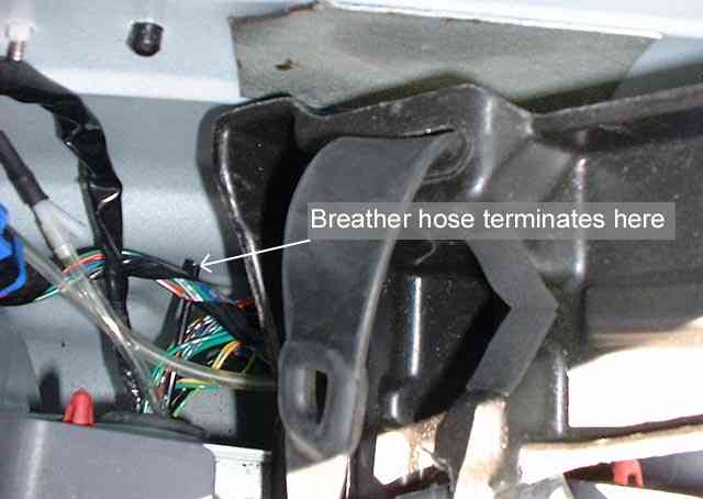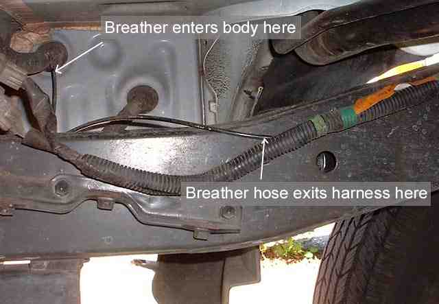 The next picture shows the breather line terminating behind the USDS rear wheel inside the body. It is easily accessed by opening the rear panel that encloses the factory jack and emergency tool kit. It can easily be extended by slipping a 5/32" ID hose over the breather line which is a nice tight fit. The extended hose can then be run up the inside of the body skin to a point a couple of feet higher than original. A self stick block with a tiewrap can be used secure the end of the new hose. The end of the hose can be bent to point downwards to prevent any dirt entering the hose. Since the original hose end was in the lower portion of the body cavity - in the remote chance that it filled with water the breather would have been submerged.