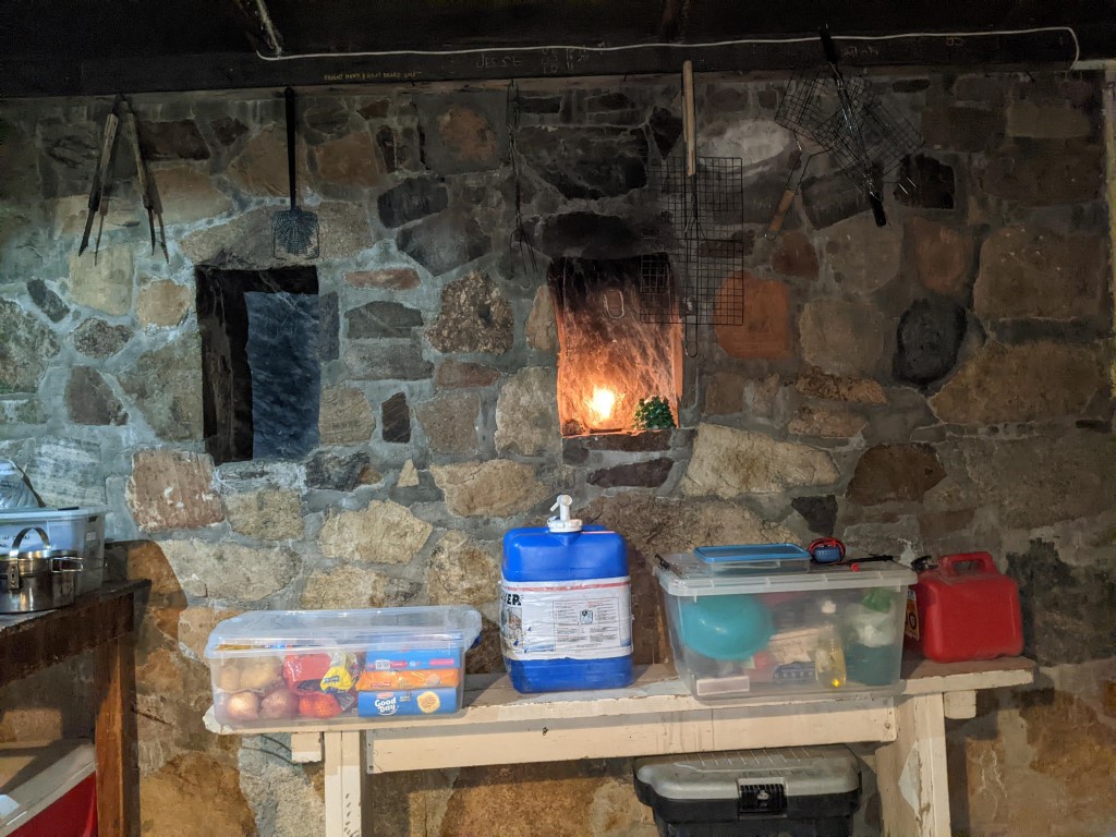 camp lights strung. Stove is fired up and water is on the boil. For
