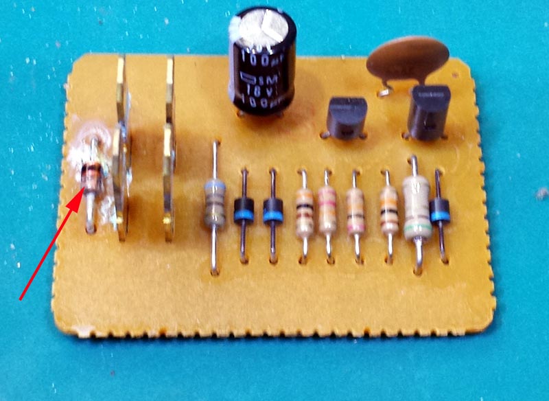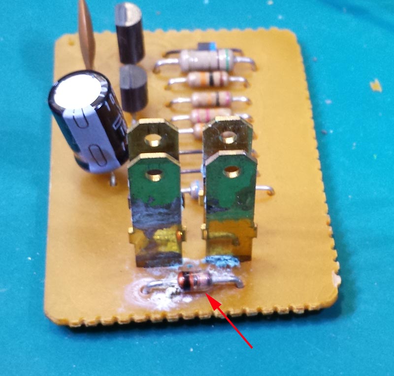 And here's a picture of the board and the culprit is an electrically leaky zener diode. The diode area has some corrosion, so a quick clean just to prevent it spreading over time to the rest of the circuit. With the diode leaking current, the ignition key bulb never quite turns off since current bypasses the transistor via the zener.