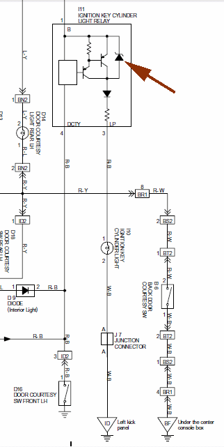 This piece of the wiring diagram/schematic shows the leaking zener and why it would allow +12V to drive the ignition key light bulb. To replace the Zener would require something rated higher than the highest battery operating voltage, so something >16V. Easier to just snip it out of the circuit.