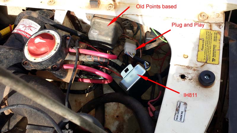 Another job was to finally replace the original points based voltage regulator (external regulator on the MQ's alternator) with a modern electronic one. Found a plug and play unit IH811 by Transpo (about $20) that mates exactly with the MQ's connector. Brilliant! No more voltage variations due to the old points based unit. Solid 14.3V regulated output. Mounting holes lined up exactly too. The IH811 is fully potted so no environmental issues. Picture below shows the IH811 hooked up so I could test and make sure it was working well before mounting it to the fender and throwing the old points based unit away.