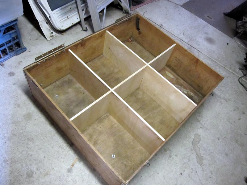 So, here's a picture of the inside of the food box with 6 partitions installed - it's got harder and harder to find cardboard boxes (clamshell banana boxes etc at supermarkets). Rod generously provided his tablesaw and cutting skill to get all the wood cut for me. The partitions are 3 sections of wood that are cut to interlock. I also picked up a section of offcut rubber for use in the back of utes. That will sit on the bottom of the box to a) prevent cans and stuff from rattling and b) allow any water that gets in when it rains to drain out of the box. The box has holes in all 4 corners for drainage.
