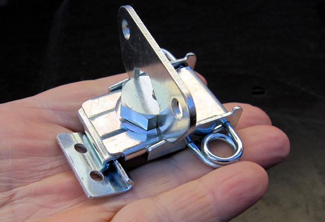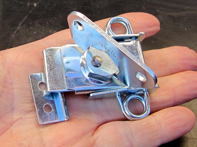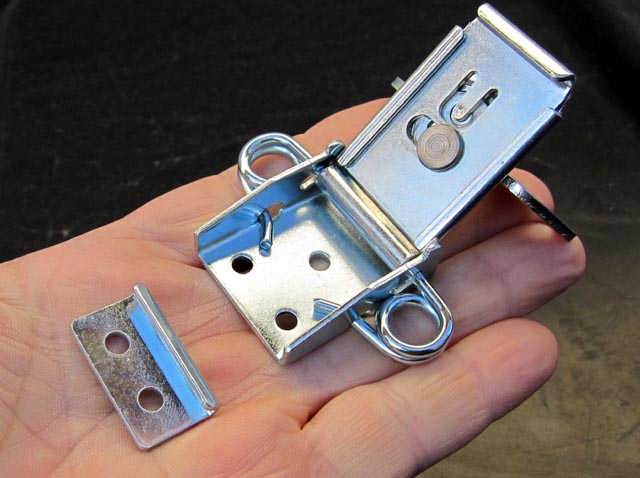 This is one of the clasps that I sourced in the US. It is made by Southco and is of great quality. The butterfly rotates to extend (to open) or retract (to lock) the clasp. The small section on the left will be screwed into the lid, through the aluminium angle and into the plywood.