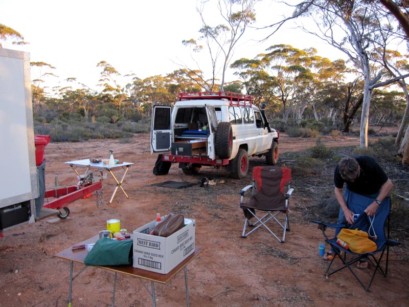 During the 2011 trip the folding kitchen table was showing signs of falling to pieces as the chipboard was rotting due to rain, age & use. Since I was replacing the food box lid, the old lid with a some cutting of worn out bits was recycled to become the new surface for the table. A few coats of polyurethane and the new table is all done and ready for many more years of camping use. It isn't our original table (long since disintegrated due to wooden legs etc), but one that my parents used years ago.