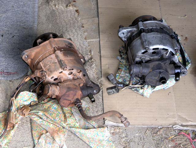 I removed the my vacuum pump (for the power brakes) and installed it on the donor alternator (on the right). I figured that since I knew mine was working fine I should use it. And then I made a nasty discovery - the rear mounting tab of the 12V alternator was NOT in the same position as the 24V unit. That meant cutting, moving and welding the tab on the bracket into the correct position. I also moved the pulley set off my alternator since the donor alternator had a bit of a ding on one of the pulleys.