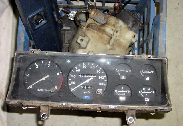 Picture of instrument cluster reinstalled into the dash. The original speedo has an orange needle, the donor meters & tacho have white needles. I kind of like the look myself. Also, the new meters have a fancy translucent design to allow the back light to illuminate the gauge better than just from light coming through the sides - quite snazzy. Of course the speedo is the original - so it has to rely on the side illumination, oh well, it worked fine before.