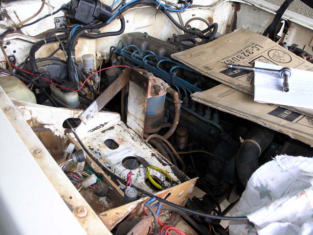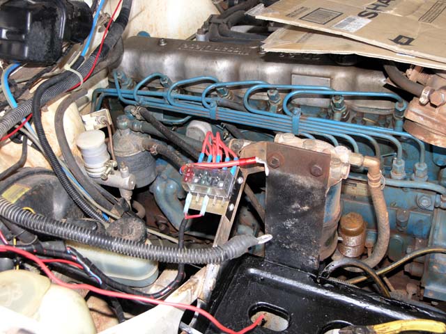 The Glow timer, glow solenoid and DPC removed - you can see the connectors on the left side of the aux battery tray. Before working on the replacing the units with the 12V versions, I am going to clean, rust proof, paint and then coat the battery tray area with roofing 'goop'.