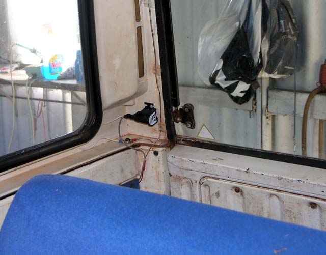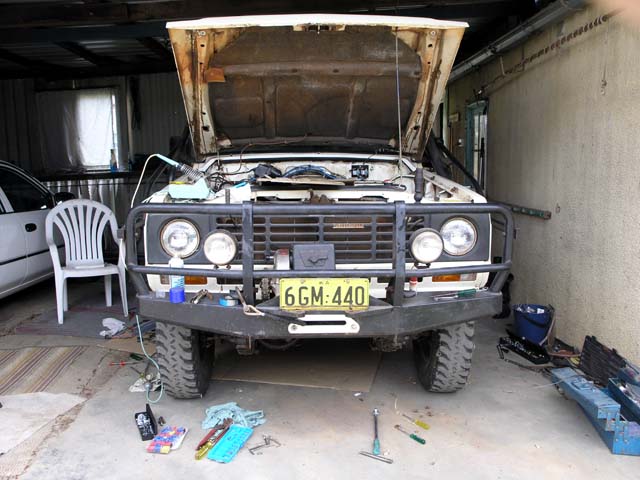 The original 24V headlights (sealed units) have been removed in preparation for fitting the semi sealed 12V units. The sun is still rising, about 6am.