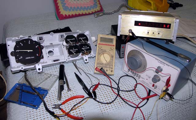 Testing the tacho with my VERY old home made frequency counter and and similarly old signal generator. The tacho is pretty well spot on 1000RPM per 50Hz. It takes an AC coupled signal >1V peak to peak before it detects an input. I need to build a controller for the tacho, haven't figure out the source of the input signal yet. The donor vehicle has an inductive pickup installed in the timing cover, but I don't plan to try and install all that stuff onto my MQ. I might just put an inductive pickup somewhere else and build a small uController based module that converts whatever that pulse rate is to the 1000RPM per 50Hz of the tacho. That will give me the factory tacho unit but with my own inductive pickup. This will be another year's project...