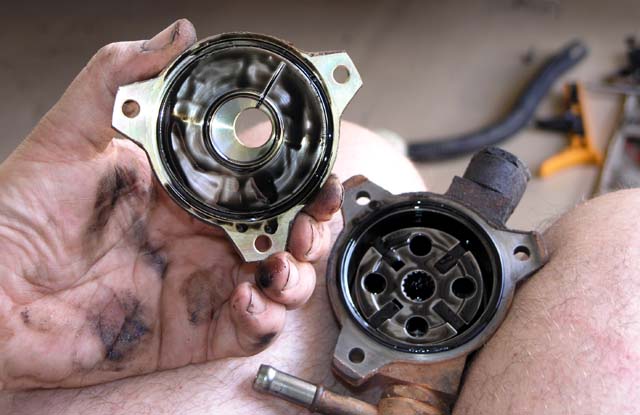 The guts that make up the vacuum pump. Looks like a rotary vane style pump. The pump is supplied with oil from the engine. The turbo also gets its oil fed from the same place.