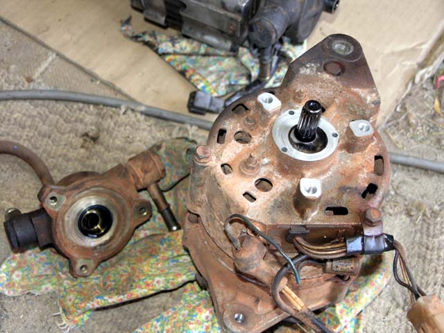I figured since I knew my vacuum pump (for the brake booster) was working that I should transplant it to the 12V donor alternator. Here is a picture of it removed from my 24V alternator and you can see the splined shaft that exits the rear of the alternator.