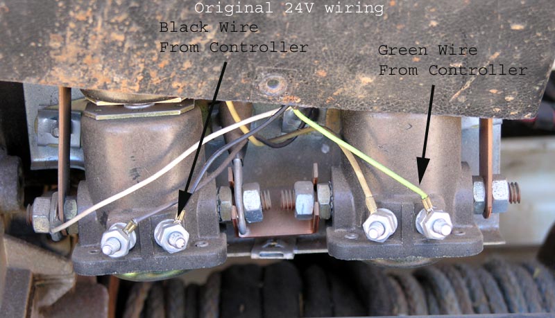 The following picture shows how the control box is wired for for 24V operation (as a reference). The key is to note where the Black and Green wires connect from the Control Box. Basically the Black and Green carry 24V from the hand control to energize one cross connected solenoid pair or the other cross connected solenoid pair.
