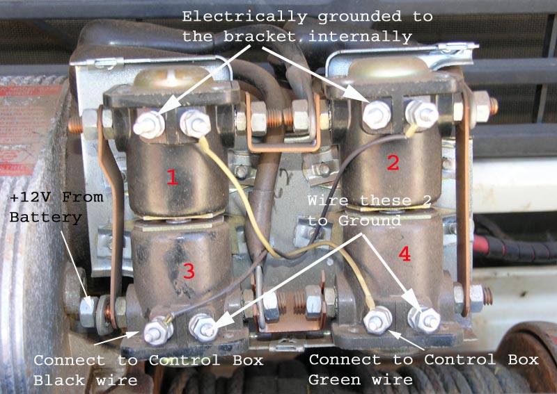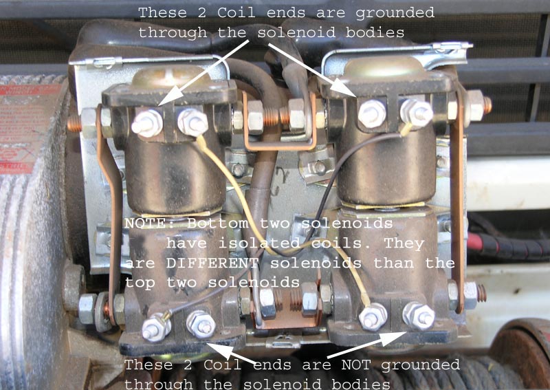 There is a subtle difference in the solenoids between a true 12V winch and a 24V winch. On a 12V winch ALL 4 solenoids have a common ground path through their body, hence only a SINGLE control wire goes to each solenoid and hence each cross connected pair is in parallel (12V operation). In a 24V winch the UPPER 2 solenoids have a common ground path through the body BUT the bottom 2 solenoids are DIFFERENT in that they do NOT have a ground path through the body. This means that the bottom 2 solenoids have 2 control wires and each one is wired IN SERIES with the cross connected mate - hence 24V operation. Took a bit of head scratching to figure out this subtle difference...