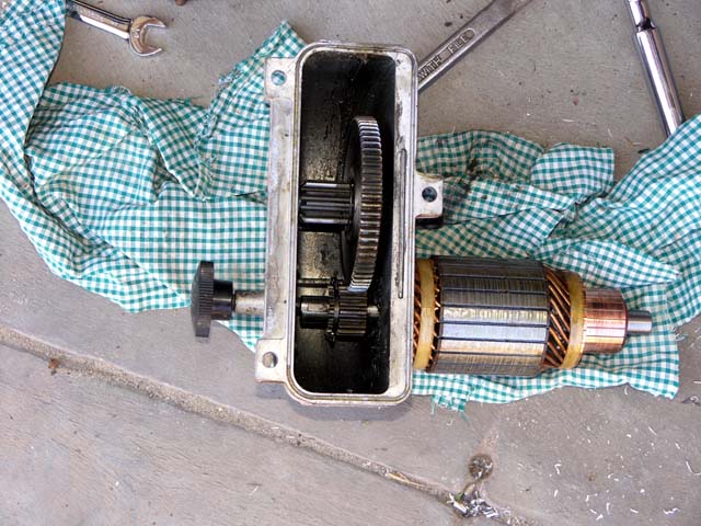 The new 12V winch motor installed into the top of the gear box. Anyone need a good running 24V Winch motor? Once the back plate is removed off the motor the brushes will be exposed and they will slide off the commutator. that allows the motor to be pulled clear of the housing and installed onto the gear box.