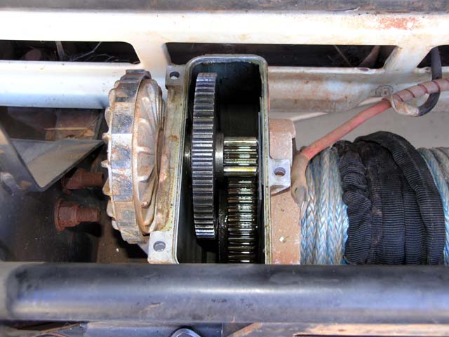 The 'bottom' part of the winch. Just another bunch of gears. Not much to a winch, basically an electric motor and a whole lot of gear reduction. The 8274 is oil lubricated and there's a 'bit' of oil at the bottom of the housing that the gears splash up when running.