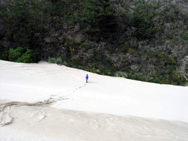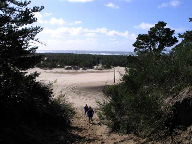 A hiking trail that loops around Lake Marie has a spur that you can take to the dunes. In the background you can see the Pacific Ocean. The kids are coming back up the trail after playing in the sand.
