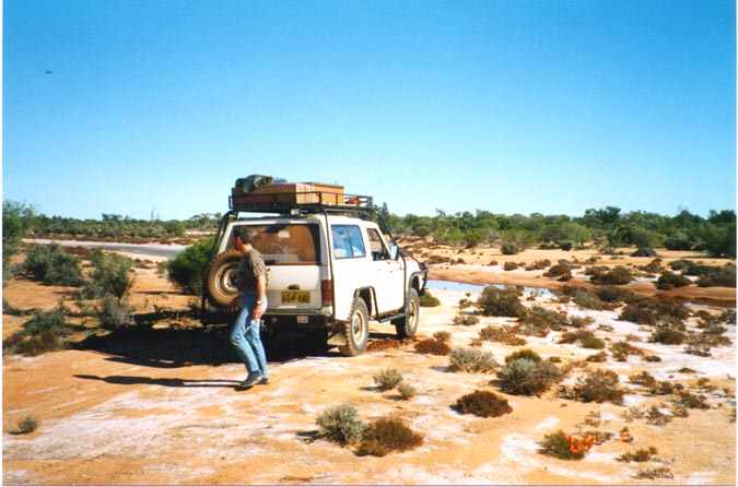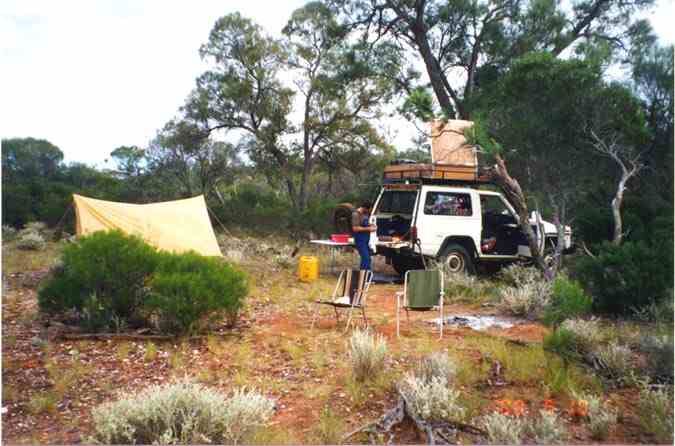 After miles and miles of old and overgrown tracks we got a flat just driving around the cleared area around Pigeon Rocks. It was quite amusing, we had stopped on a small rock area about 3 metres from a camp spot from 2 years back and while looking around we heard the familiar hiss of a flat tyre. Out with the Tyrepliers (very impressed with their ease of use), break the bead, clean out the tiny wooden stake in the tread then patch the tube and put it all back together again. Needless to say that our camp spot had been chosen for us. A couple of days later we headed east via some quite old and flakey tracks. The GPS and moving map software was very useful in determining where a track was likely to be. The usual problem occurs when a track 'hits' a rock outcrop, some detective work is then required to find where the track continuation is - not always in the same direction as the track in! We worked our way easterly and then connected to a pretty decent track heading north to Johnson Rocks - always a great spot to visit due to its large covered gnamma hole - a great supply of fresh drinking water. We then took the main road (good graded gravel road) past Hospital Rocks and then towards Menzies. About 14km past Hospital Rocks there is a track that heads north, this is the way we headed - some interesting country, including a reasonable number of salt lakes and crossings (fortunately no drama).