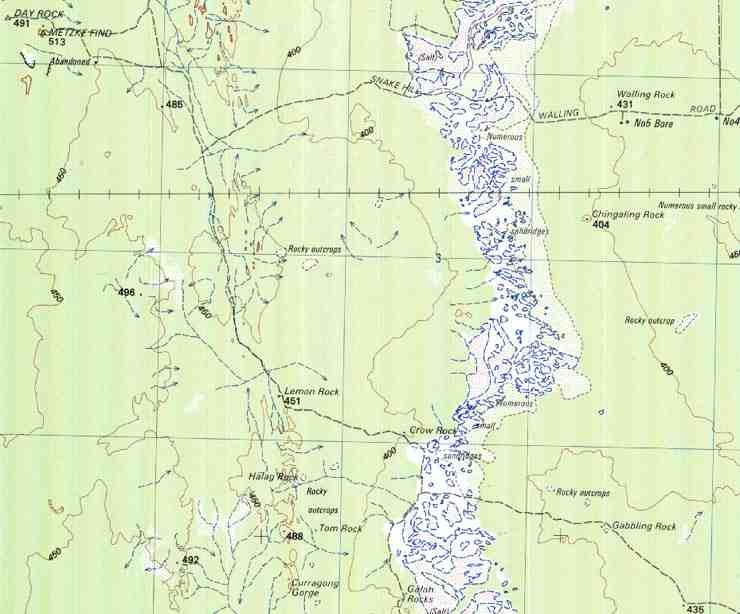 The following section of a topographic map (1:250,000) shows the area around Galah Rocks (bottom middle) up to Day Rock (top left). The blue grids are 10km apart.
