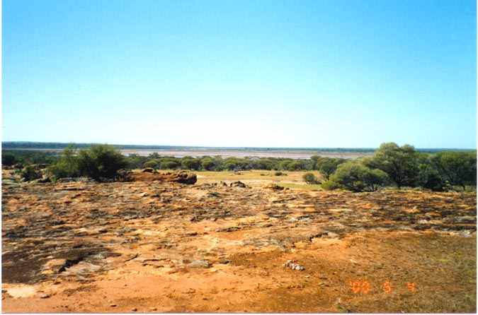 We headed from Perth to Northam, then up to Goomalling to Wyalkatchem to Mukinbudim (yeah, they're REAL places) and then a bunch of back roads and tracks up to Mt Jackson and then to Pigeon Rocks. The following picture shows some of the country south of Mt Jackson, we're on a rock outcrop looking towards the east. In the distance can be seen salt lakes that still have water in them from the cyclone.