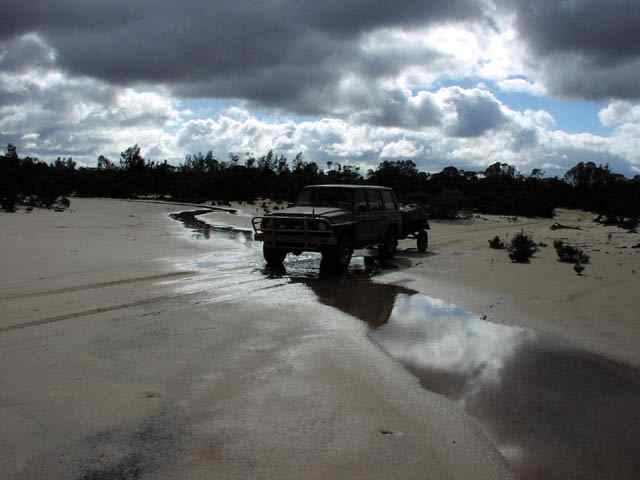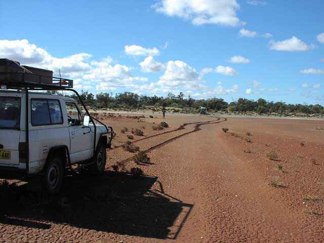Just south of Weowanie Rocks - a small river running between two salt lakes. The ground was sandy and rock hard as witnessed by the tyre tracks. Lionel's nissan patrol is the last in our convoy going across.