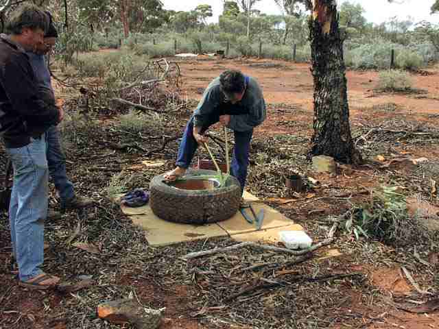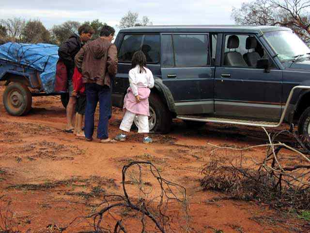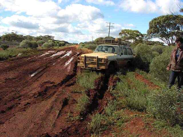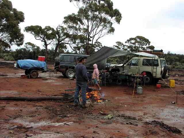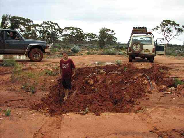 Just about to hit the transline north east of Coolgardie - one of my many shortcuts. Tim's affinity for mud is obvious here as he rushes to stand in the newly turned soil. The others decided not to tread in the footsteps of my front/rear locked swb nissan. You can imagine from the photo what a nice pickle the nissan was in for a minute or so - got out on its own steam though. This was to set the stage for the next part of the trip ;-) You can see behind the blue nissan the pools of water on the side of the track - definitely soggy ground abounds.