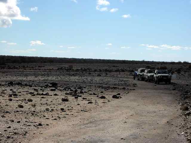 The convoy on the southern edge of Lake Minigwal. The lake is surrounded my many mounds that appear to be rocky but on closer examination are made up a material that is quite brittle and the ground is somewhat spongy - very strange sensation walking on it. I doubt it would support the weight of a vehicle.