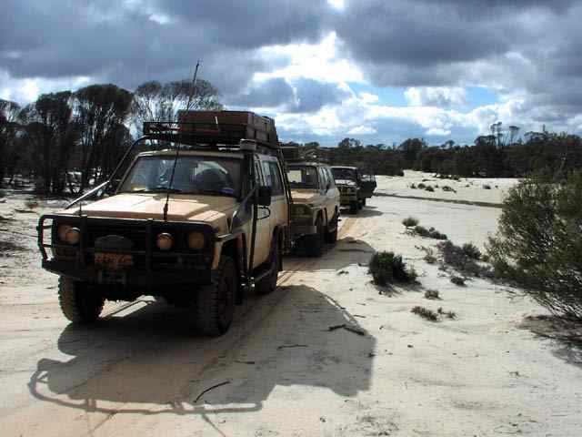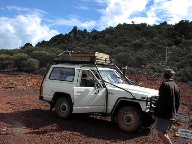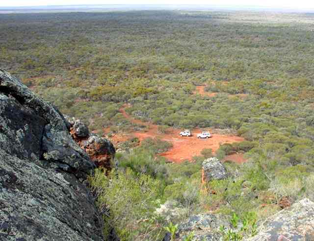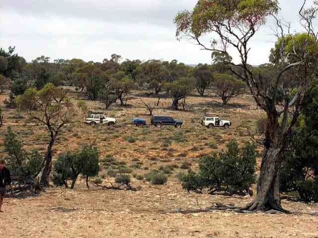 Same place, different view. Basically the end of our trip, a couple of k's further on we hit a good graded road at Duladgin Rock and followed that south to Yellowdine, from where it was a ride back on bitumen to Perth. This is when Lionel decided his guage was still showing 1/4 tank and he was complaining that I should fill up further down the road rather than at Yellowdine (my tank holds 160 litres). Guess what, about 60km later (after having passed Southern Cross) his tank ran empty - and the guage still showed 1/4 full ;-) Lucky for him Kim still had about 15litres of fuel in a container and we were able to put enough fuel into his tank to get to the next fuel station. The story then comes out that he's never run the tank lower than 1/4 on the guage - the nissan is new to him - he also discovered the 'long' range tank is only 120 litres... I had taken 40 litres of extra diesel for myself (on the roof) and 40 litres for him - but we'd already transferred that fuel to our respective main tanks by this point in the trip.