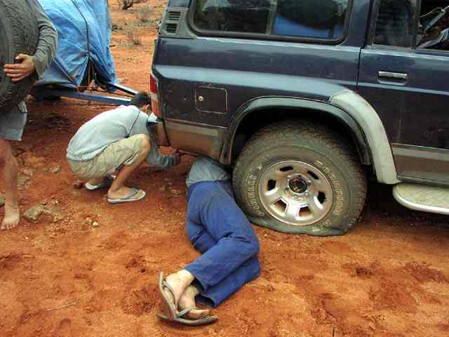 Good a time as any to repair the #2 flat tyre of Lionel's. I think I've made a Tyreplier sale here ;-) Talk about all the conveniences - even a set of nicely placed concrete slabs! Richard & Kim look on as Lionel works on flat #2.