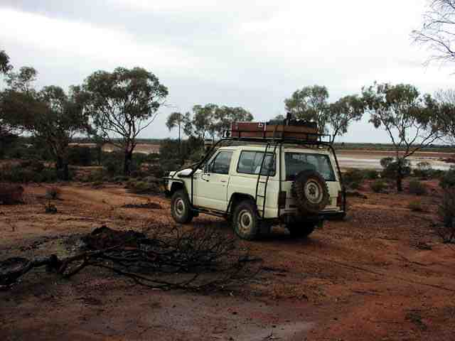 Lake Rebecca - the old road. We decided to take a 'short cut' and use the old road instead of the new one that goes around the lake. Well, it was a shortcut only in distance ;-) On first appearances the lake appeared way too wet and muddy when we walked onto it. But since I was in front and already had my tyres on the edge and needing to turn around I reversed around. While reversing I figured, what the heck (especially when Lionel mentioned something about me being too scared to try going in) and kept reversing to see if it was actually hard enough to get onto - with the plan that I could winch myself back out if necessary. Anyhow, I successfully got across the first bit onto slightly higher ground. After that the others came over to where I was too and we started our great lake crossing adventure. I went ahead a stretch at a time (heading forward this time!) and then the others would follow. We did this for 5.5km - quite the adrenaline rush, especially since it had been raining the last few days and a local had told us the main road was quite boggy in places... Sometimes we would get out and check the firmness of the ground under the mud with a shovel - better safe than bogged to the axles on a salt lake ;-)