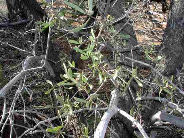 A close up of a Sandalwood tree and it's leaves. Only the old dead wood has the characteristic sandalwood smell. The leaves look very much like the quandong tree (its close relative). Both are parasites that need an appropriate host tree's root nearby to tap into.