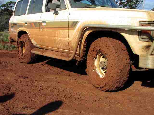 Yep - dragged! The tracks on the left are from Lionel's nissan being winched out and the ones on the right are from Kim's cruiser being winched/dragged out. I think the lesson that they learnt was it's usually better to drive through the center of the track where the water is than around the edge where the water has fully saturated the surrounding uncompacted soil... (but that's just my theory)