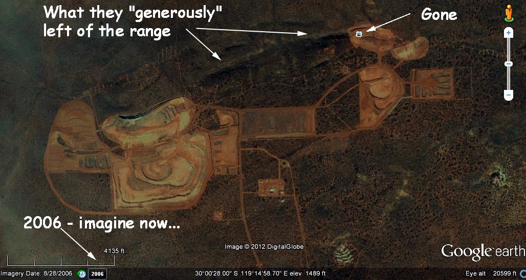 Check out this report http://epa.wa.gov.au/EPADocLib/2500_B1256.pdf and specifically page 38 to see what our wonderful Mining industry has done to this area. Here's a picture (very close to the same spot as the above picture) and the report's own words (2007 report, so imagine how much more "devastated" this area is now...). You can visit Google Earth to see the most recent damage that has been done and they haven't finished yet!: