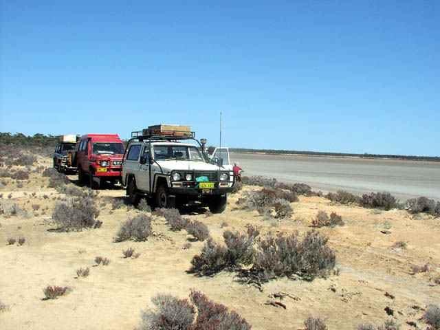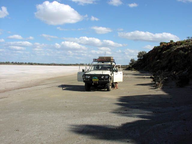 We found an old set of tyre marks a bit north east of the homestead heading along the edge of the lake. This gave us the incentive to follow them for about 12km or so along the western edge of the eastern arm of Lake Barlee. Rod got to do some salt lake driving (which he earlier seemed less than eager to attempt). By staying within close proximity of the lake edge we had a relatively hard surface to follow and 2wd high range was more than adequate. I attempted a few departures from the lake edge and did get to spin a bit of mud off the tyres before quickly retreating to the lake edge again.