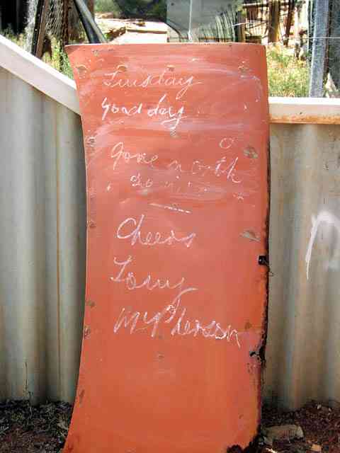 Rod had got this box made up to locate at the site (as close as we could determine it to be) of the Mt Manning Meteorite. The track (shot line) to the meteorite site hadn't seen a vehicle for many years. Kim & Paul didn't make it on this trip, the inscription was made before they cancelled on the trip. Rod scored 3 flats coming out of the track to the meteorite site. I scored one on the minibike I was using as the 'leader'.