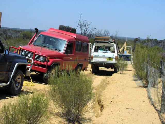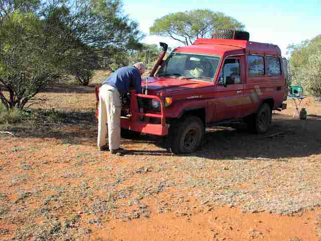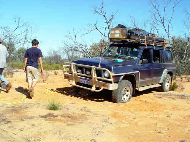 Heading south along the rabbit proof fence. Lionel's last flat (blue nissan), a good attempt to match or beat Rod's five flat total. Another side staked tyre, which was pretty well the cause of all the flats on this trip. My white nissan with razor blade 7.50x16 8 plies got a total of 0 flats on this trip.