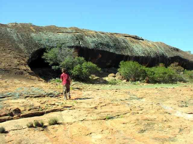 Malgar Rock. The picture shows a small cave structure that contains a reasonable amount of Aboriginal art. Bats also call this home. Malgar Rock is on Barlee Station. We met the station owners and they appreciate a call or a drop in to tell them you're in the area & driving around on the station tracks. To get here we took an old and quite overgrown track (don't do it if you're worried about brush constantly rubbing on the sides) north from Quartz Bore then west along breakaways and small outcrops (quite scenic). Over the rock outcrops the track can be hard to find/follow. On the worst of them, the station owners have built small rock cairns (we added a few more) to mark where the track goes. Lionel & I had been on this track about 20 years ago and it was a little but not that much better than this time.