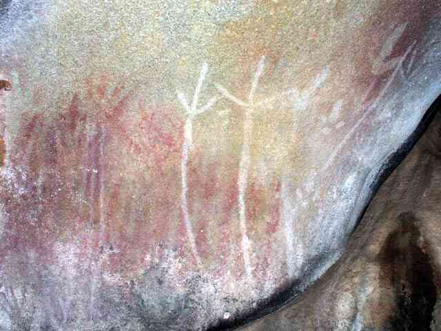 Some of the Aboriginal art inside the cave at Malgar Rock. There are some paintings (mainly hands) and some engravings (emus).