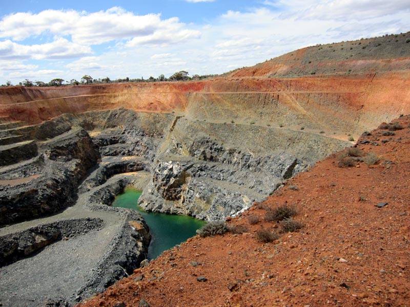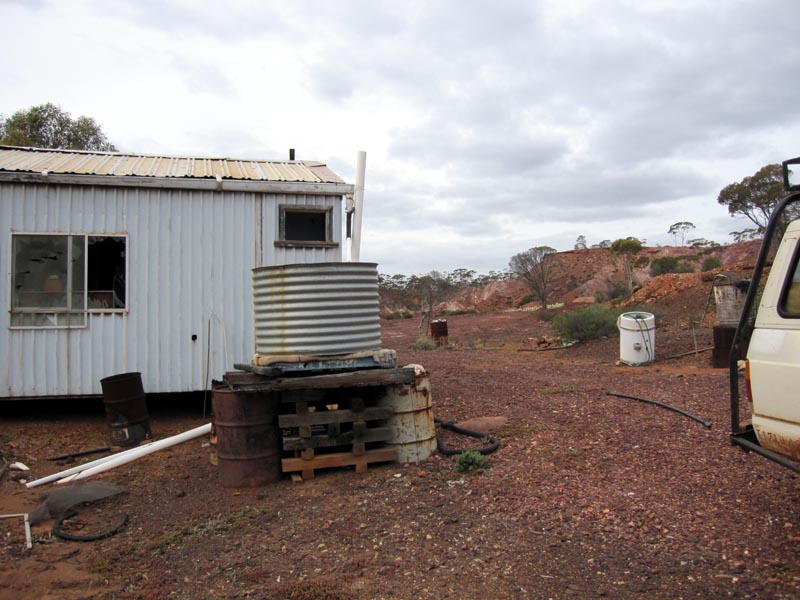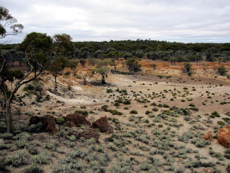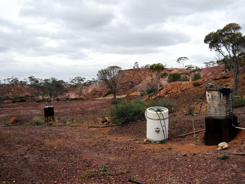 We then continued south and hit the Evanston-Menzies road and headed east to Mulline and then went south again. Checked out one of the big holes left by a mining company and was educated by David (geologist) about oxidization and leaching of sulphur from iron pyrites into ground water to form sulphuric acid. Great legacy that the mining companies are leaving us as they dig hole after hole in the goldfields. Seems that they have an open license to dig their holes and then leave them complete with contaminated water for a future generation to deal with... Those trees in the distance are fully grown gum trees, just to give a bit of an idea of the scale of these holes.