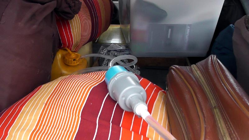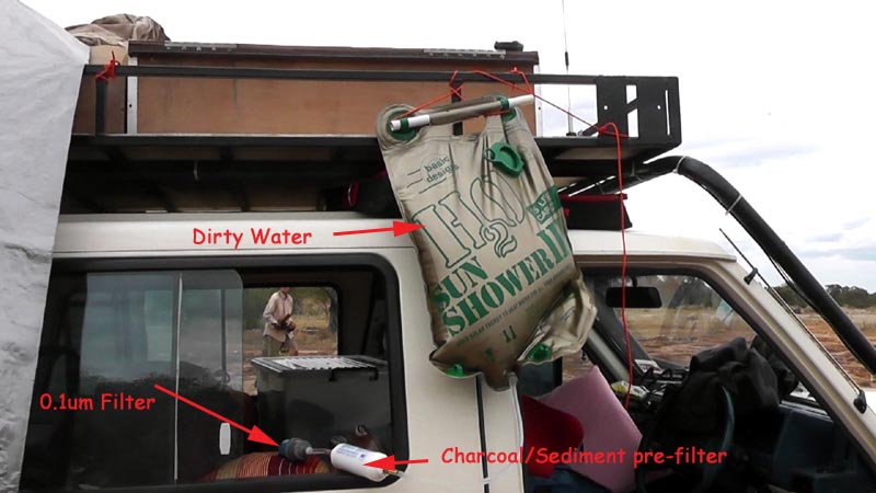 With the 20 litre water container still in the vehicle, I could just feed the output of the 0.1um filter directly into it. With plenty of quality tygon hose I could also run the output of the filter directly into pots or our 1 gallon container. On previous trips I've always had to move the 20 litre container in and out of the vehicle. With the gravity feed scheme, I don't have to move the container and can draw water from it with the same hose and siphon action. Very nice improvement and NO MORE PUMPING :)