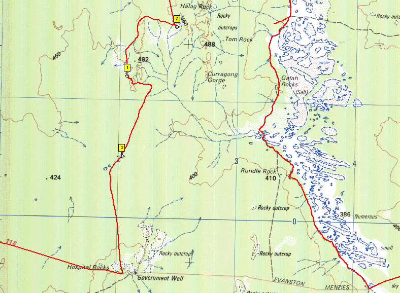 Screen capture of the tracklog from this part of the trip. The #3 marker is at the claypan 2 pictures above. The #1 marker is at Lawrence Find, the location of the above picture. #2 marker is at a neat depression in the following pictures. The red left tracklog is all on tracks and shotlines that aren't shown on the 250k topo raster maps. Some of the tracks ARE on the old Geology 250k maps and of course Google Earth photographic level imagery shows most of the tracks. WHY have Dola/Natmap left this information off the 250k topo maps is anyone's guess...
