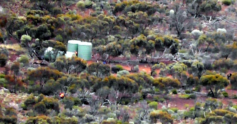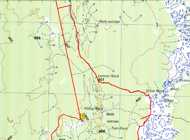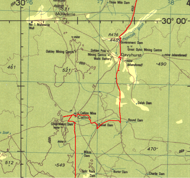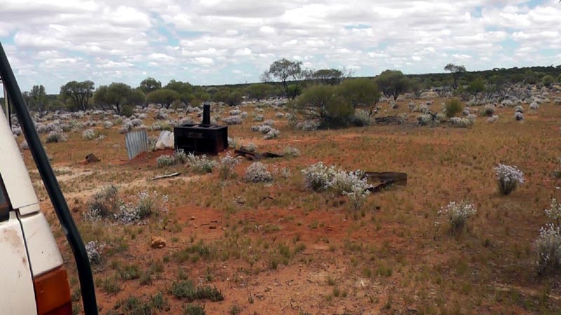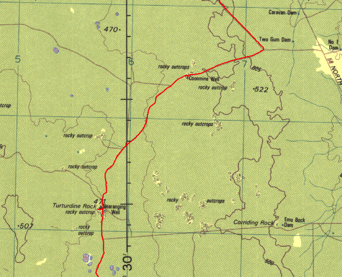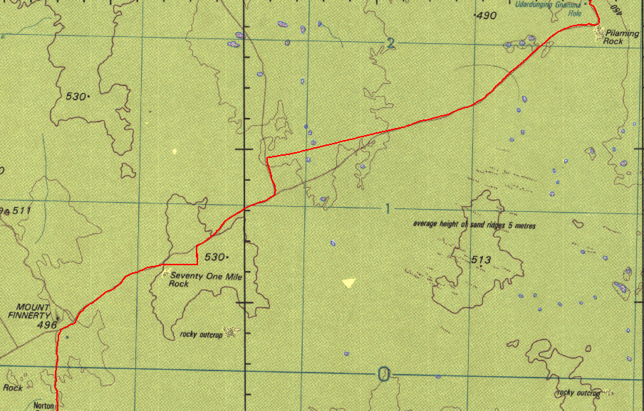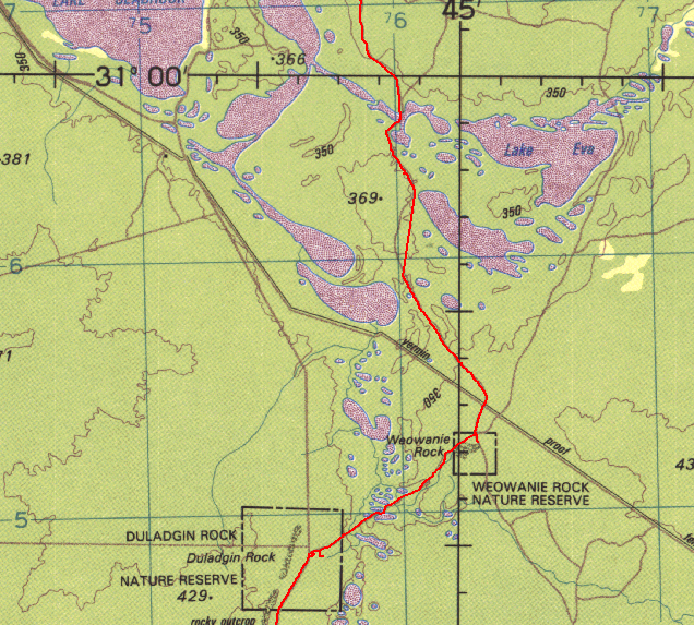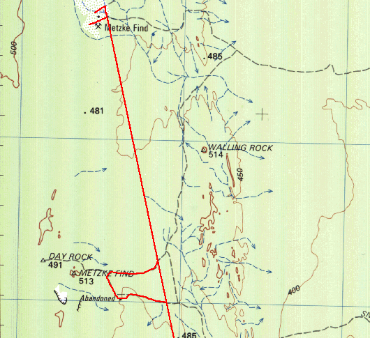 Illaara is on the map at the location labeled "Abandoned". Of course on the Geology 250k maps it is named as Illaara and again, Dola/Natmap has left info off the 250k topo maps for reasons best known to them. The red lines are from the GPS tracklogs, you can get an idea of how straight the shot line is from the log! We checked out Illaara and then headed back to the shot line and on to Metzke's Find. We also found the first track leading off to the west will line up with a new track/cut line that heads up the eastern side of Lake Barlee (just east of Johnson Rocks). These are relatively new shot lines/tracks, presumably from more sandalwood work.