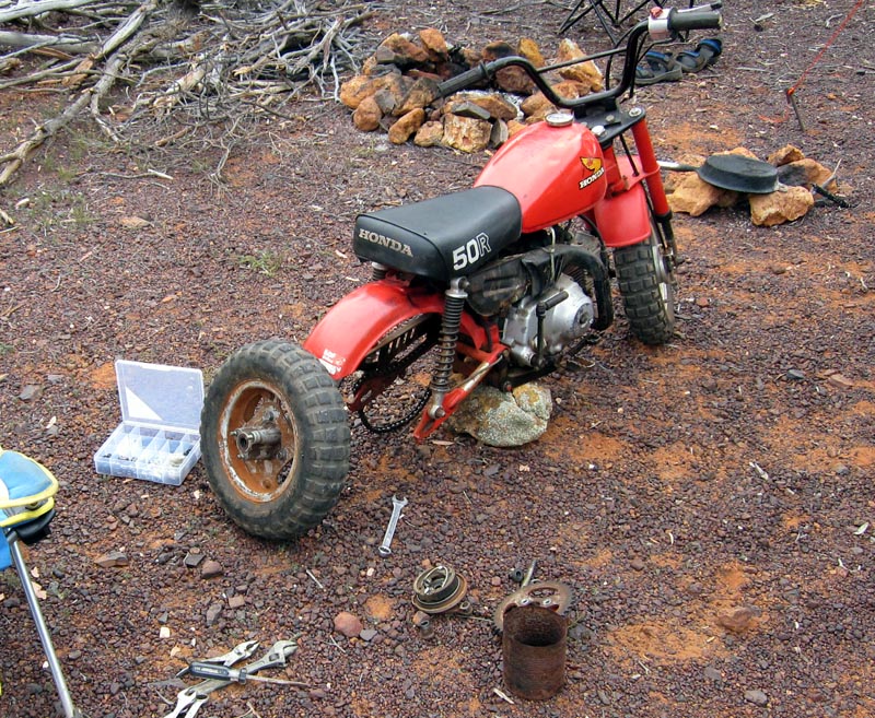 Camped at the Mt Manning range on the east side. Seems like a cursed location for the Z50, 2 years back I snapped the chain while here. This time the 3 bolts that hold the wheel/rim to the hub/brake assy backed out and 2 fell out. I got back to camp with wobbling rear wheel and one bolt barely holding things together. Fortunately the threads hadn't stripped out of the aluminium hub and my 'spares' box had the correct replacement metric bolts. I worked some metal epoxy into the holes to 'lock' the new bolts in place and all was good for the rest of the trip.