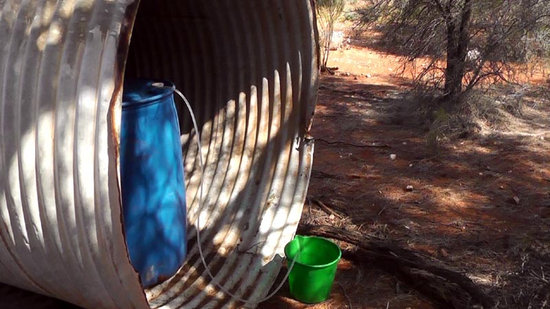 We continued heading south with the aim to come out on the transline access road. We reached the Breakaway Mining Center and decided to drive in and give it a look over. Abandoned somewhat recently, but both tanks (another is on the back side of the building) contain a full supply of rainwater captured from the roof and redirected by the gutters. In the picture, just behind the nissan is a hot water system, basically a heat exchanger sitting over a fire.