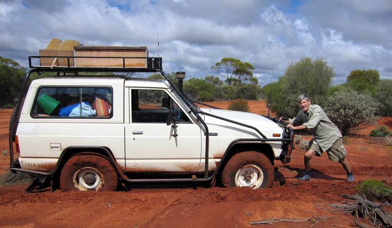 At Hospital Rocks we were entering the track that leads up to Lawrence Find and discovered some mud on the side of the main road. Had to back up and lock the front hubs to allow us to 4wd through the mud and onto the track. Basically a few metres of mud and then it was smooth sailing all the way up the track. David goofing off for the camera :)