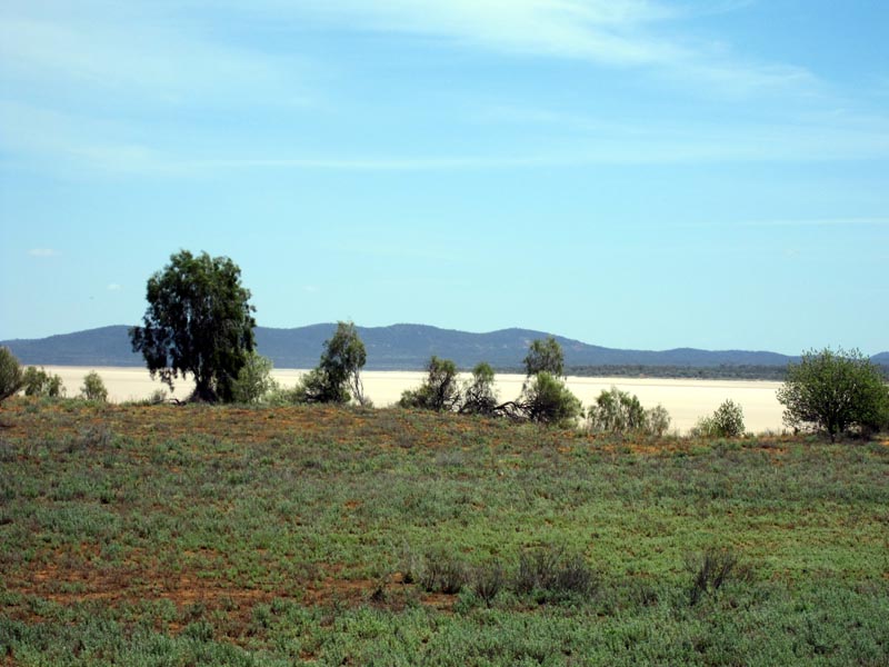 We turned off the transline access road to head south around the eastern edge of Lake Seabrook. This is a picture looking west across Lake Seabrook with Koolyanobbing Range in the background.