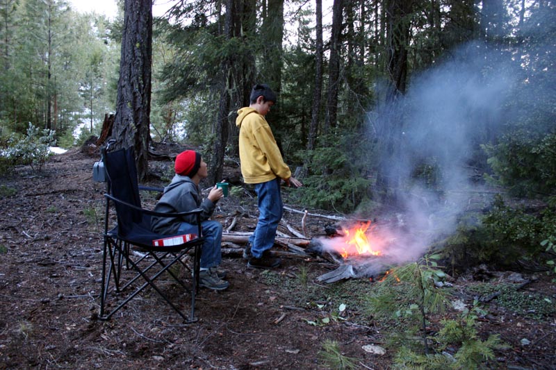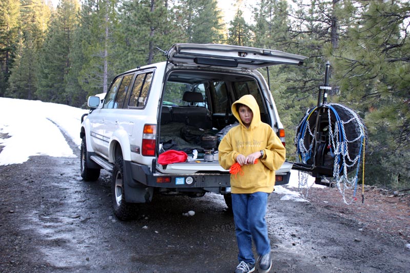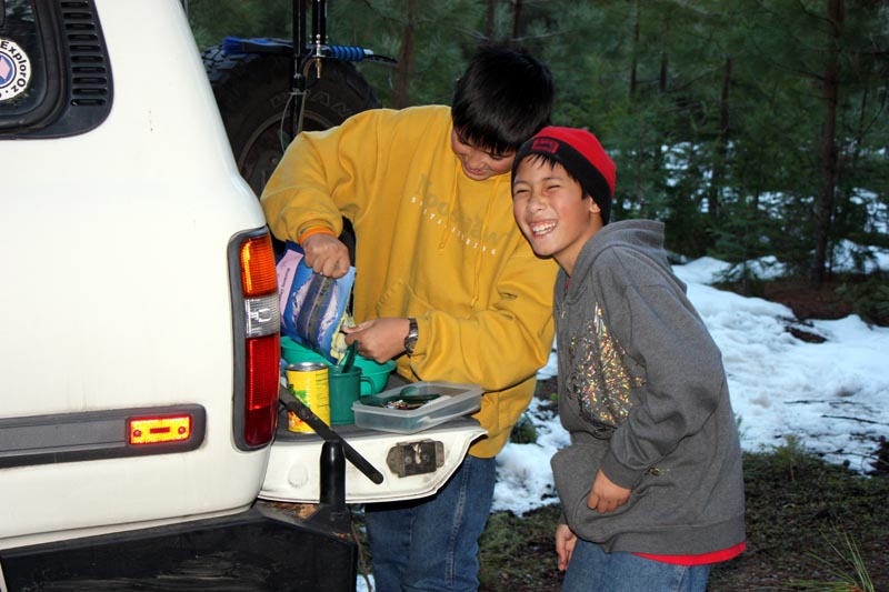 Drove until we found a cleared area on the road and that was to be our 'camp' for a couple of days. The 12yr old and I slept in the back of the 80 and the 10yr old across the front seats (sheet of plywood to made a flat bed). A few thermarests and sleeping bags and we had a nice warm/dry place to sleep. Looks like we're heating some water on the stove on the tailgate - early morning and time for breakfast! Part of the fun of preparing for going camping is to let the kids go through our collection of dehydrated foods and desserts - which I then add some of my choices to. With 10yr shelf life freeze dried foods it makes it so easy to plan a camping trip - just toss a few packets (and some extras just in case) in a box, a stove, some water and you have the basics to survive for a week or so.