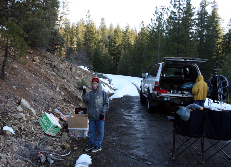 Wider view of our 'camp' Younger one is tending a small fire in the ditch on the side of the road. Boxes etc are from the back of the 80 - removed so we can sleep in the back. We put the boxes on rocks in the dry area. I think my younger one is deciding whether to throw a snowball at me... It's not bad when you can camp smack in the middle of a road :)