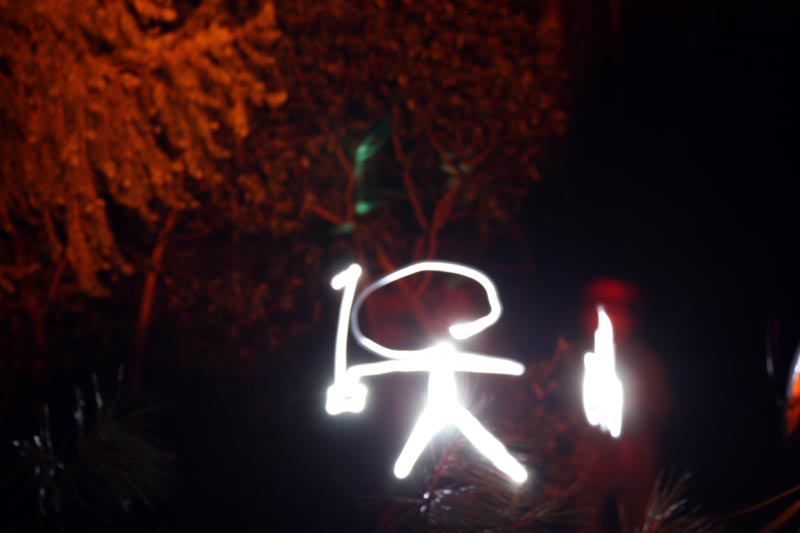 I told our younger boy that if he used one of our LED lights as a 'pen' and I set a long exposure on the camera that he would be able to "draw" with light. This shot came out particularly well - he created a stick figure with a light saber and he's on the right flashing his saber up and down - quite an impressive shot.