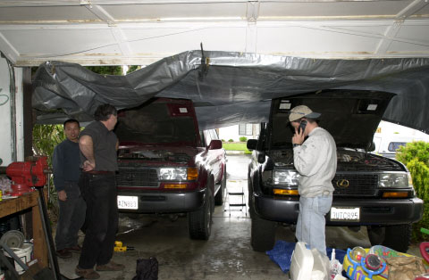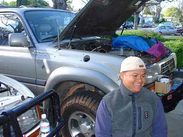 The next picture is Amando showing happiness that all the damage to his 80 is now complete - note he is sitting, i.e. he is taller than 4'. Notice his 'modified' ARB roobar - the jury is still out regarding the thought process that was required to come to the decision to hack off the top part.