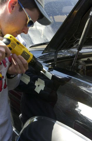 Step drill works really well for opening out the stud holes - no risk of any sheet metal distortion. A step drill is the correct way to drill bigger holes in thin metal. We drilled 1/8" pilot holes first and then used the step drill to open them up. Notice Manuel wearing his high performance safety goggles ;-)